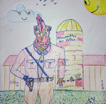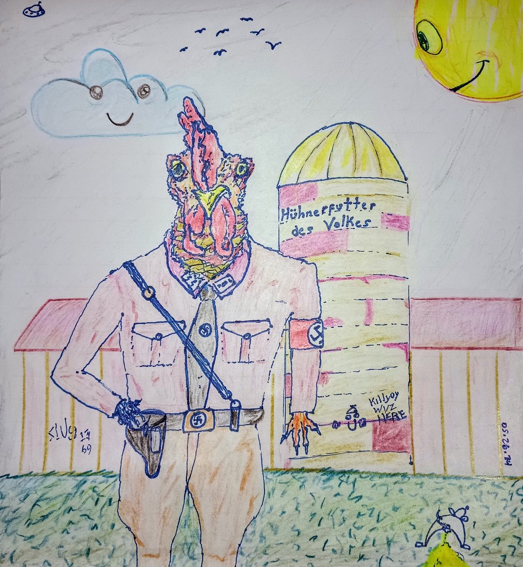 Gunther, feathers ruffled but spirit unbroken, met Siegfriedâs gaze with a defiant crow. âWe are fucking reclaiming what is ours by right, you Goddamned Sauerkraut Piece Of Shit!â he retorted, his words a manifesto of insubordination.